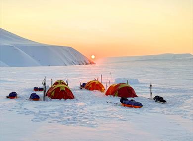 Den eneste turen med bilvei til toppen av fjellet - hvor fotturen vår starter. Vi befinner oss nå i et fantastisk bre område hvor vi går på truger over breen om snøforholdene tilsier det, og opp til et utsiktspunkt. Herfra kan dere nyte roen og stillheten i et frosset arktisk område. Området er vakkert med snødekte fjell og vakker natur. Når sommeren kommer, smelter snøen og da er det perioder hvor vi ikke benytter truger når vi går i vanlig fjell terreng fram til isbreen. Kan være partier med rullestein.