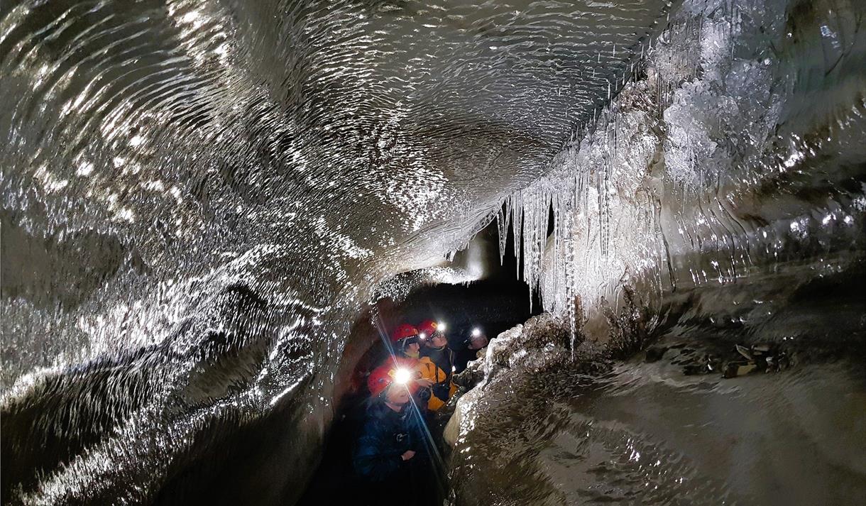 Her inne bruker vi tid, slik at du får oppleve en underjordisk verden med haller, trange passasjer, og tykke lag med mektige iskrystaller.