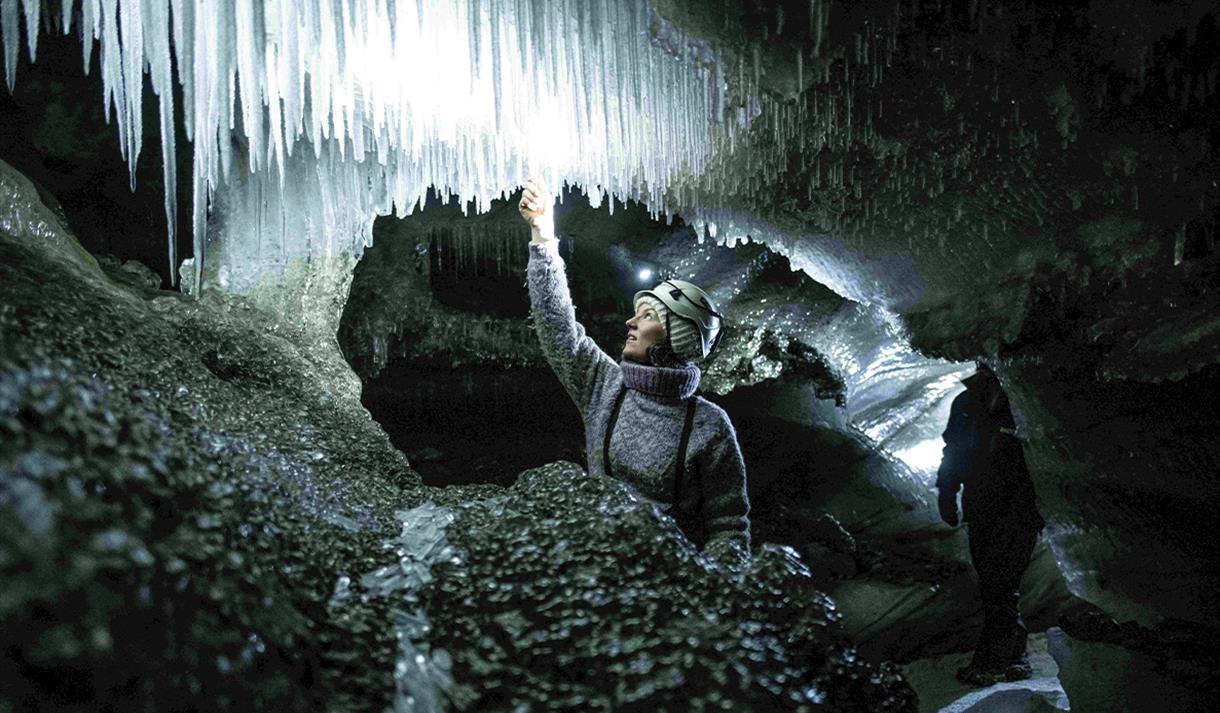 Du får utdelt en kraftig hodelykt, som lyser opp den smale gangen foran deg. Som regel kan man gå et par hundre meter innover i grotta før man kommer til slutten (eller den blir for vanskelig å forsere). Som oftest er det flere steder hvor grottegangen åpner seg opp som en stor katedral av snø og is, et mektig og fascinerende skue.