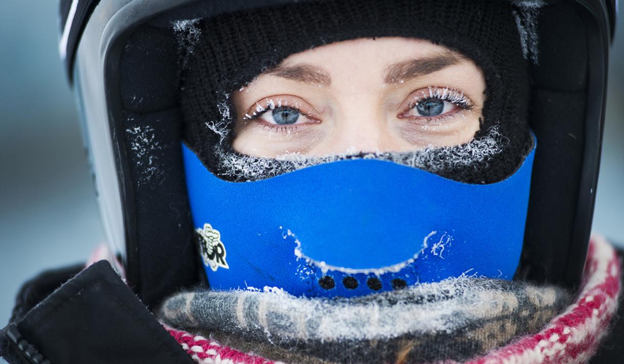 Snøscooterbekledning: Dress, sko, votter, hjelm, snøbriller og ansiktsmaske
