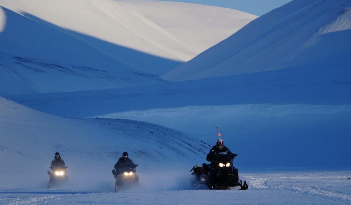 Fra Longyearbyen kjører vi gjennom Adventdalen og følger scootersporet mot Elveneset, et av områdets beste utsiktspunkter. Underveis får du oppleve Svalbards åpne landskap, snødekte fjell og vakre kontraster i lyset. Ruten er variert, men lettkjørt, noe som gjør turen ideell for både nybegynnere og familier.