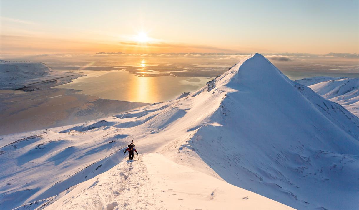 Du vandrer gjennom Svalbards rå og uberørte landskap, og mens du går mot toppen, forvandles utsikten rundt deg til en uendelig panoramafilm av fjorder, isbreer og fjell som gløder i sollyset.