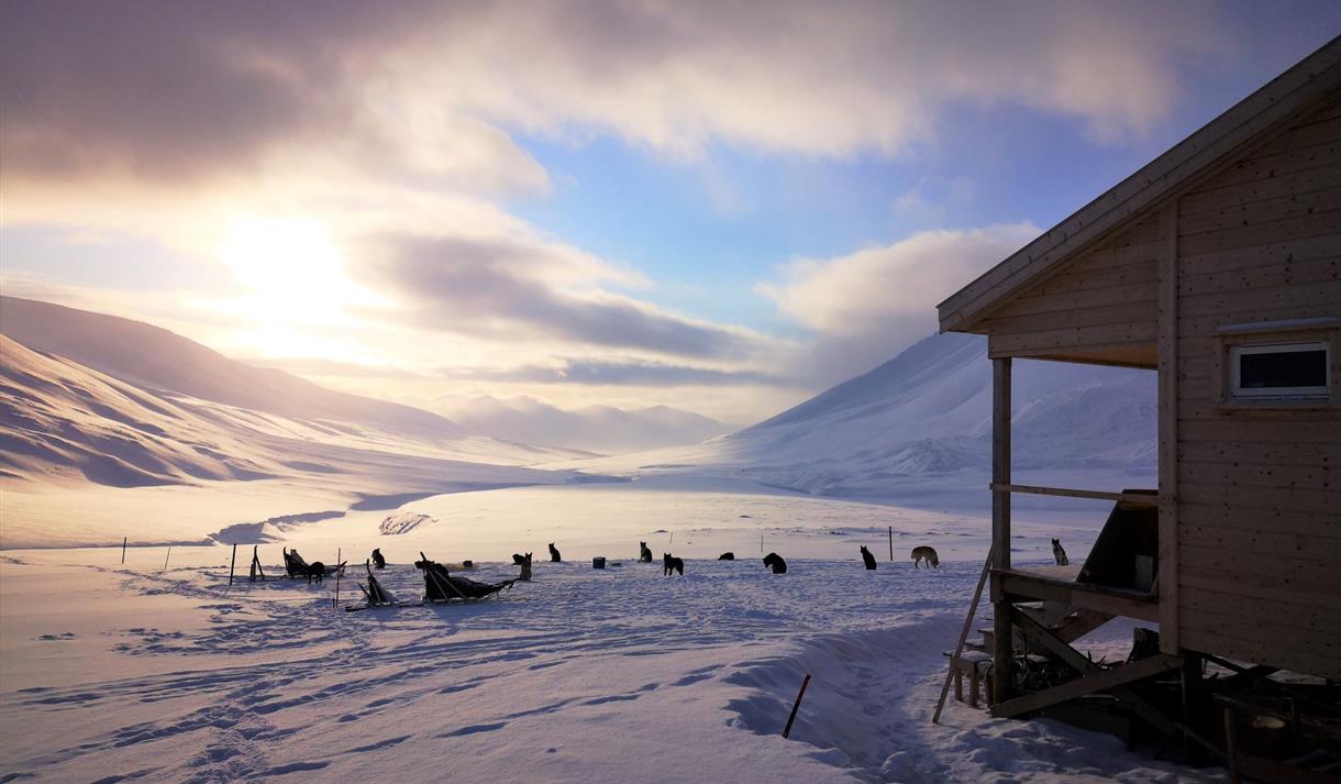 Hytta har tre soverom og en deilig badstue med Svalbards beste utsikt. De omkringliggende isbreer, fjelltopper, vide daler og dype elver er vårt "hjem". Her har vi tilbragt uendelige mange timer med våre ivrige huskier. Det er her vi helst trener våre hunder for våre lengre ekspedisjoner til Nordpolen og for det lengste hundeløpet i verden Iditarod i Alaska. Vi elsker dette ville og vakre området og blir aldri lei av å reise i dette fantastiske landskapet.