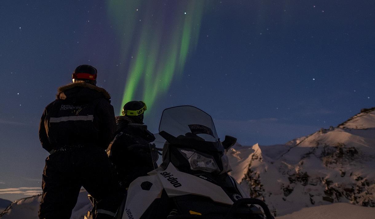 Bli med oss på Nordlysjakt. Sammen kjører vi ut i mørket med snøskuter i håp om å fange dette magiske lyset. På turen vil vi stoppe ved vår Gamme for bålkos og en hjemmelaget tre-retters middag.