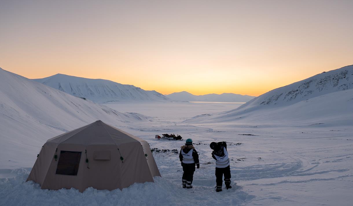 - Sove i vår komfortable villmarksteltleir med varm peis inne
