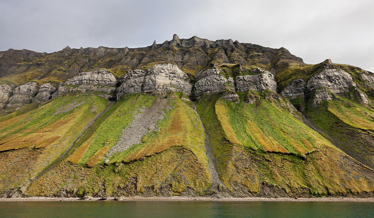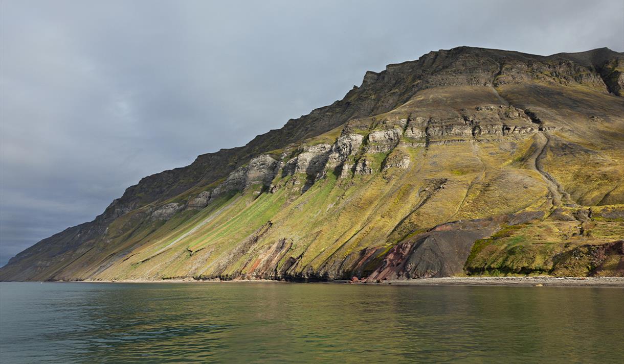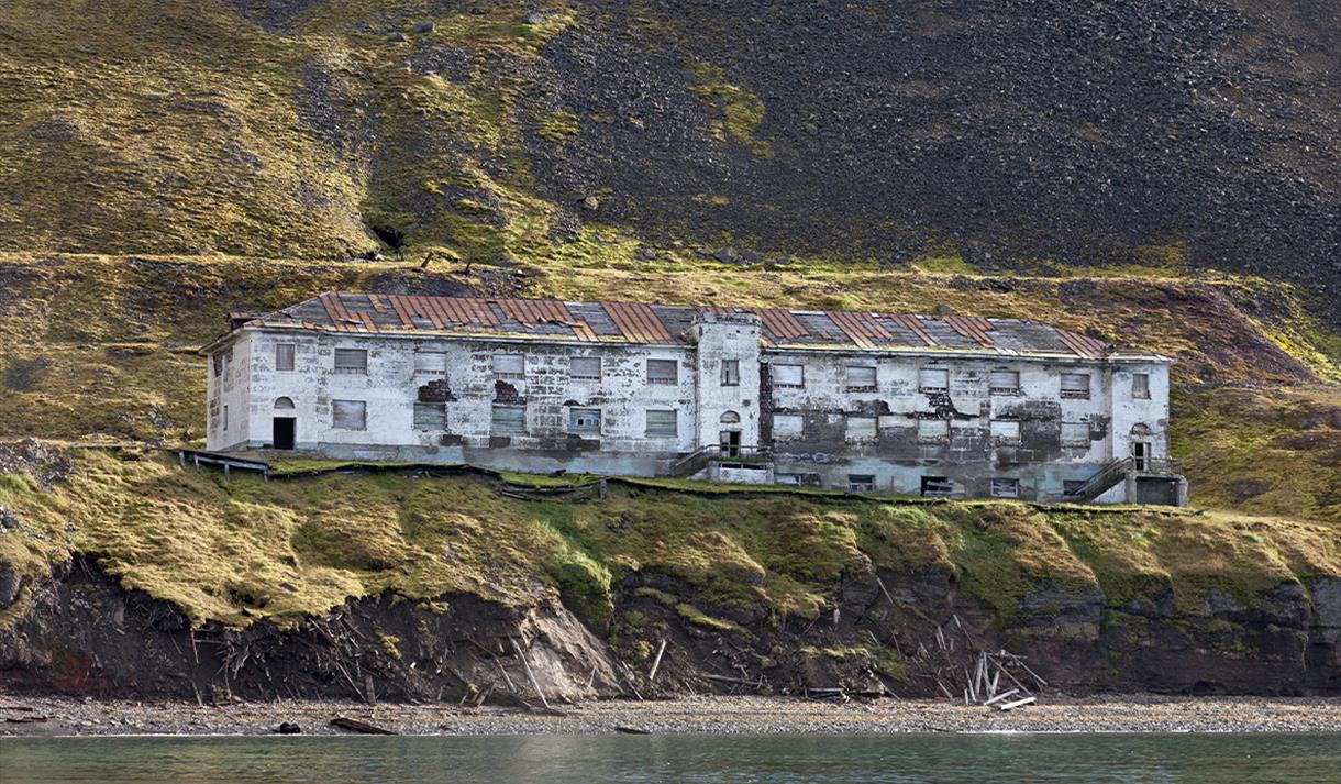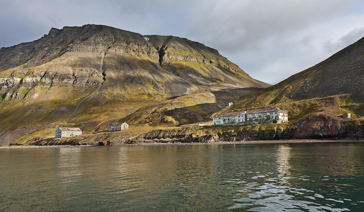 Turen går videre til den forlatte russiske gruvebosetningen Grumant, som ble forlatt i 1961-62. Det er nesten ubegripelig at de forfalne husene som klamrer seg fast i fjellsiden i dag, en gang var en av de største bosetningene på Svalbard. Vi blir fascinert av gruvehistorien og tidens påvirkning, før vi fortsetter turen til Hiorthamn, som ligger rett overfor Longyearbyen i Adventfjorden.