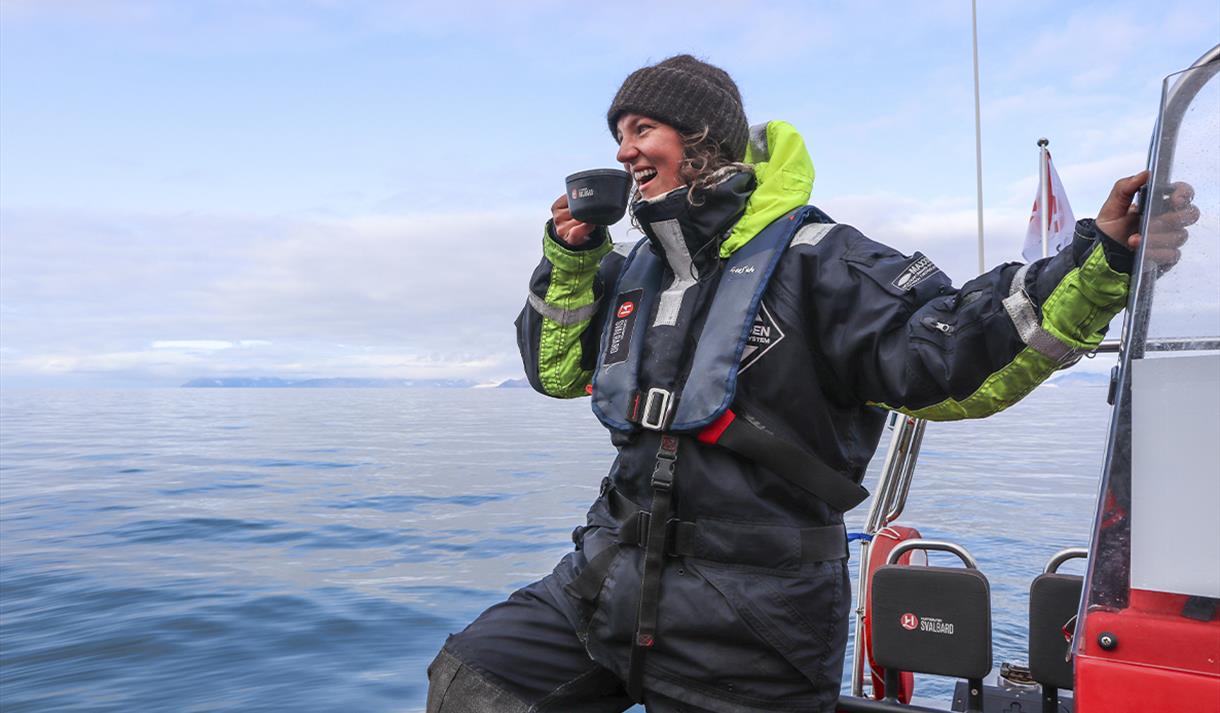 Guiden din henter deg på hotellet og tar deg med til vårt ekspedisjonssenter. Her vil du bli utstyrt med en flytedress og briller før vi fortsetter ned til havnen og den åpne polarcirkelbåten som vi skal ut på fjorden med.