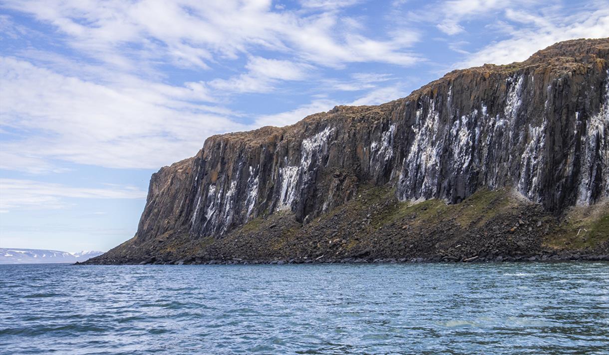 Vi setter kursen ut i Isfjorden og kjører østover, mot Diabasodden. Det unike geografiske landskapet i området gjør det til et perfekt hjem for mange av de fuglene som besøker Svalbard om sommeren. I fjellveggene kan vi observere mange hekkende lundefugler og et stort antall polarlomvi. Her vil du virkelig få oppleve et variert fugleliv på nært hold, fra vannet. Kanskje får vi til og med besøk av en hval ved båten!