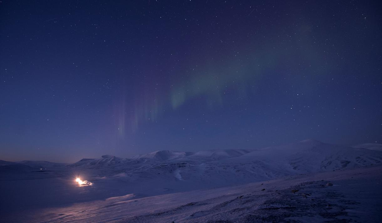 Arktisk stillhet venter når vi forlater Longyearbyens lys og glir inn i mørket, kun opplyst av måneskinn, stjerner, og våre snøscootere. Utforsk historiske kulturminner som den gamle flystripen og flyvrakrester i Adventdalen, med vakker utsikt over Operafjellet og andre bygninger.
