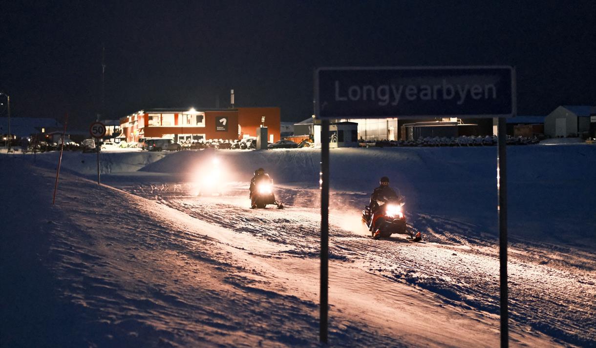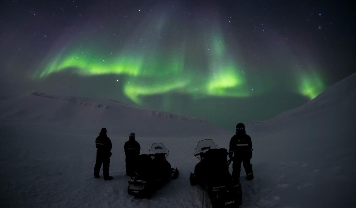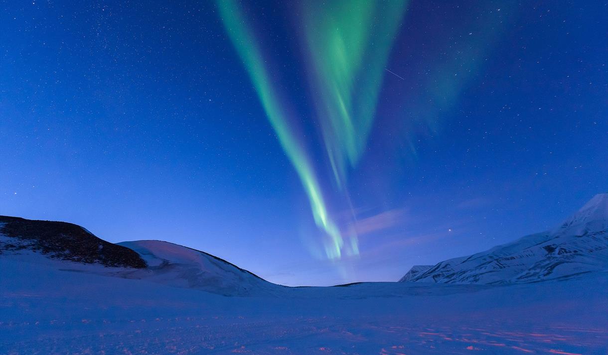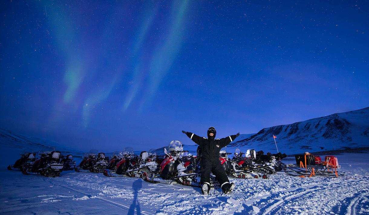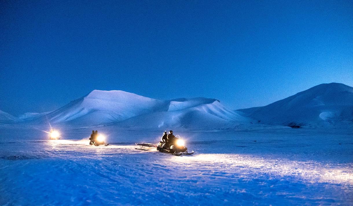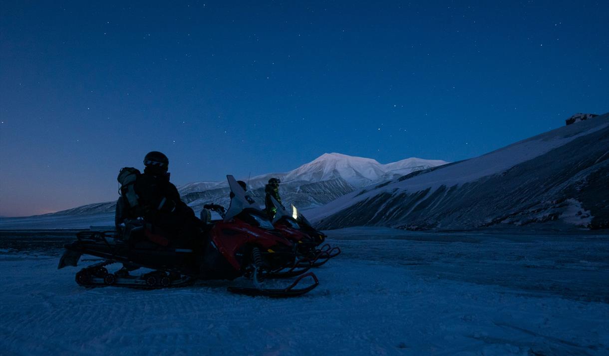 Du trenger ikke dra langt for store eventyr i Svalbards landskap, så bli med oss på snøscooter for å komme oss på utsiden av Longyearbyens lysboble ute i den vakre Adventdalen på jakt etter det flyktige dagsnordlyset!