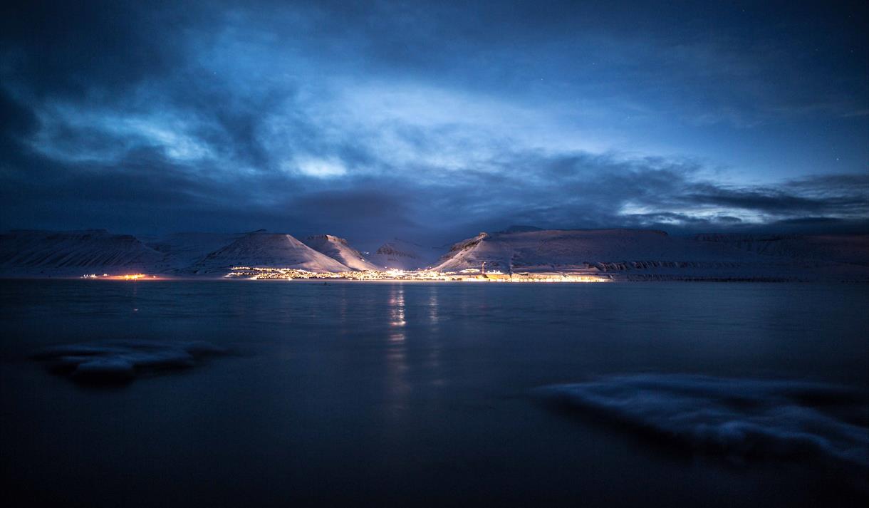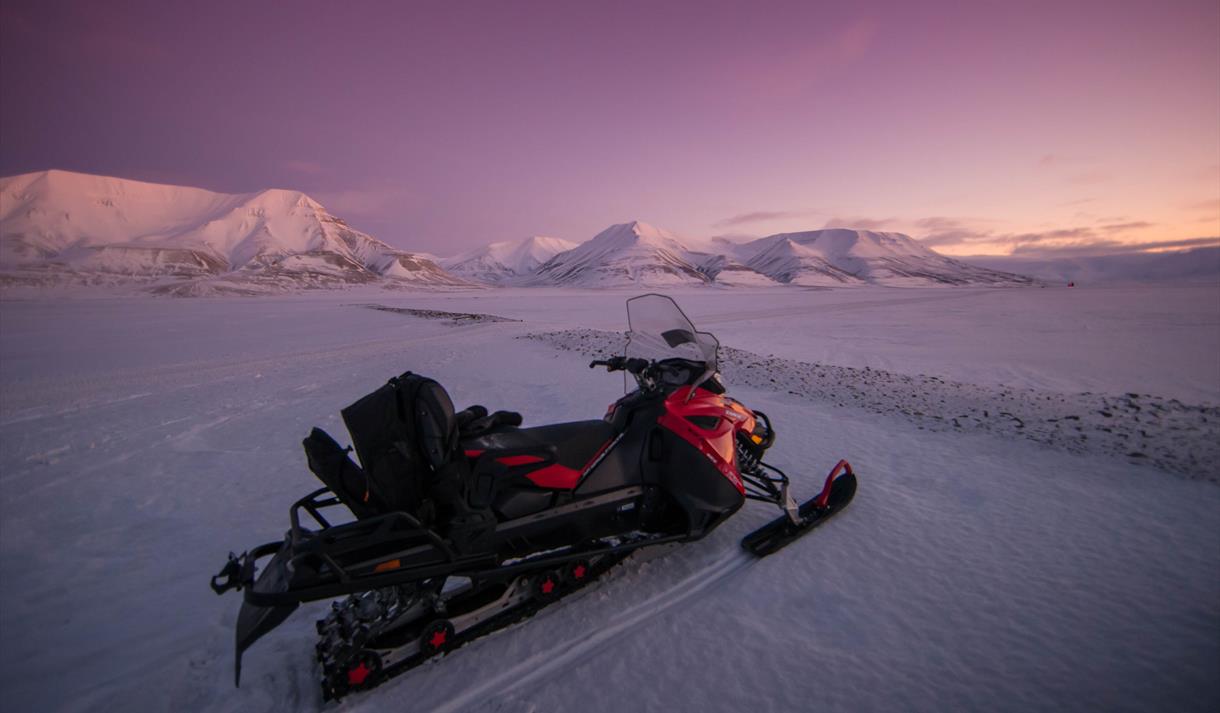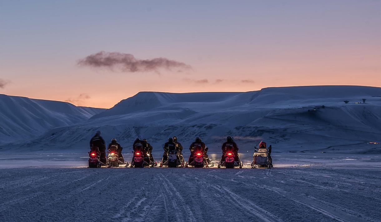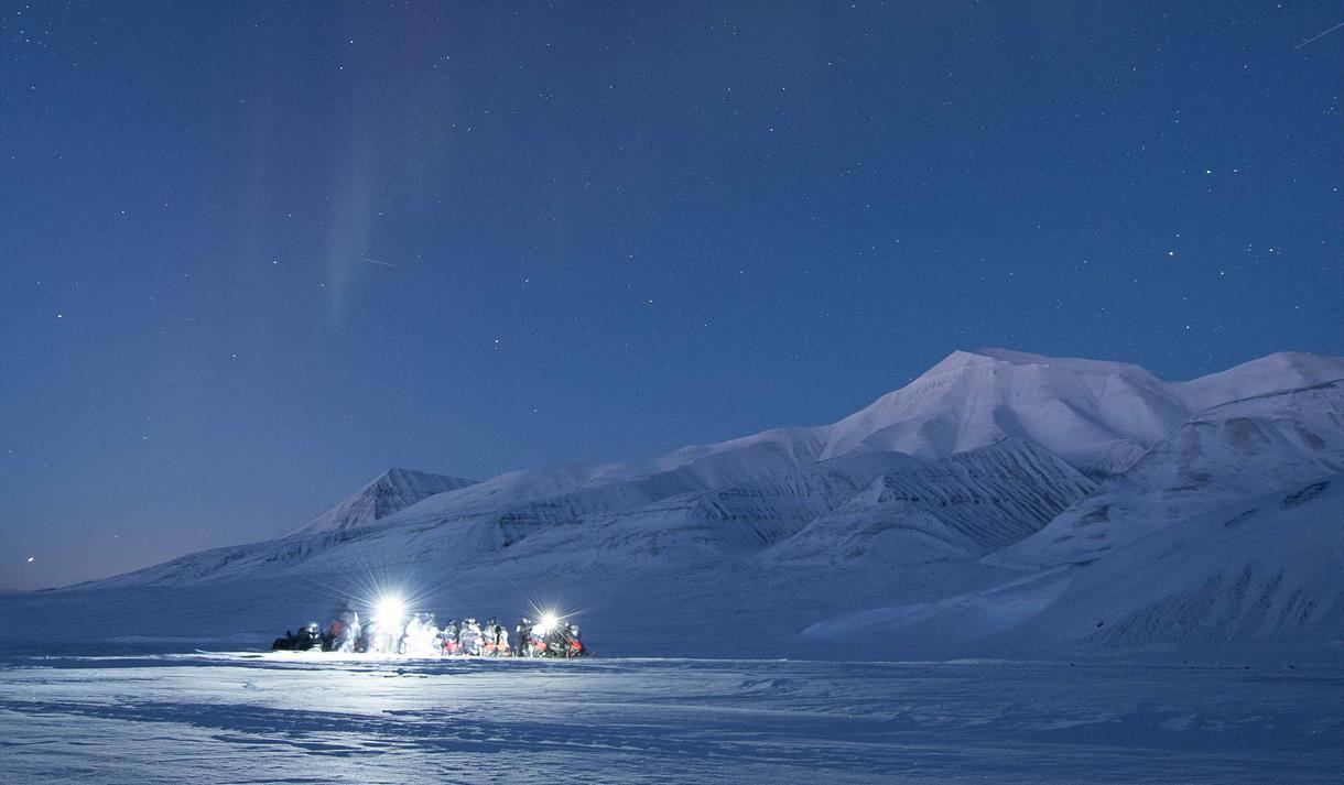 Bli med oss ut med snøscooter til det vakre Svalbardlandskapet som omgir Longyearbyen, og la deg bergta av det unike blå lyset som karakteriserer polarnatten.