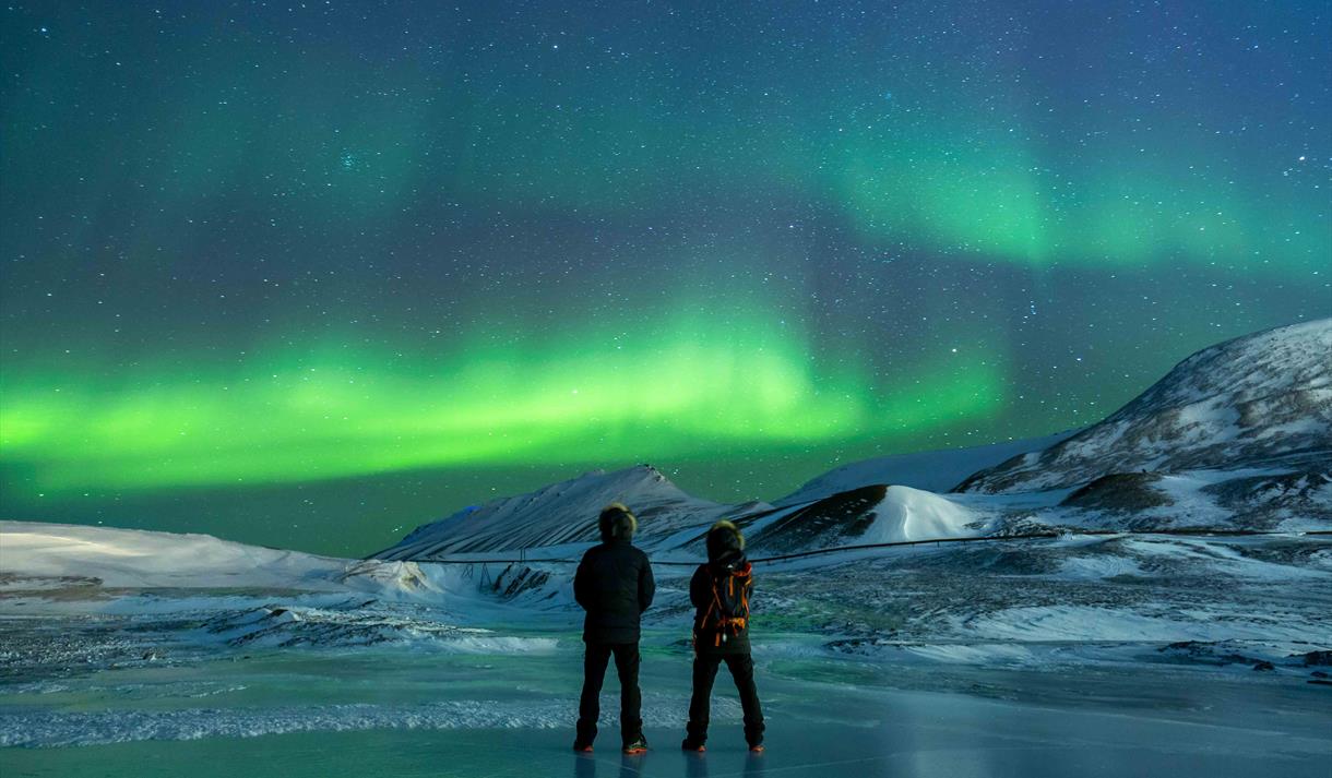 På denne tiden av året er sola under horisonten hele døgnet, og vi har muligheter for å se stjernehimmelen og nordlyset hele døgnet. Turen går inn elvedeltaet i Adventdalen, forbi den gamle flystripa, langs Operafjellet og til kjennemerket ”Jernsenga”. Videre kjører vi til en pingo, som er et naturfenomen som oppstår i områder med permafrost og isbreer. Vi har nå kjørt ca. 20 km fra Longyearbyen, og her stopper vi for å nyte stillheten i polarnatta. Vi serverer også en kopp med noe varmt, og en god historie eller to.