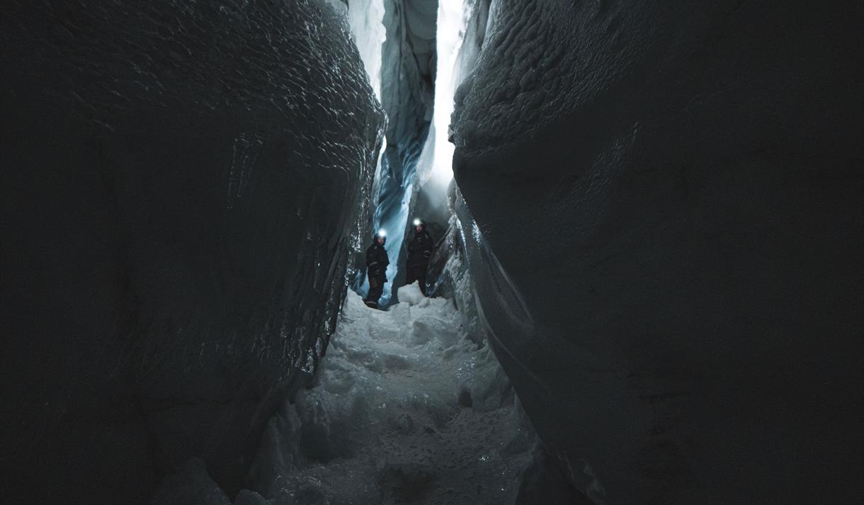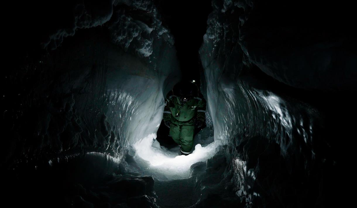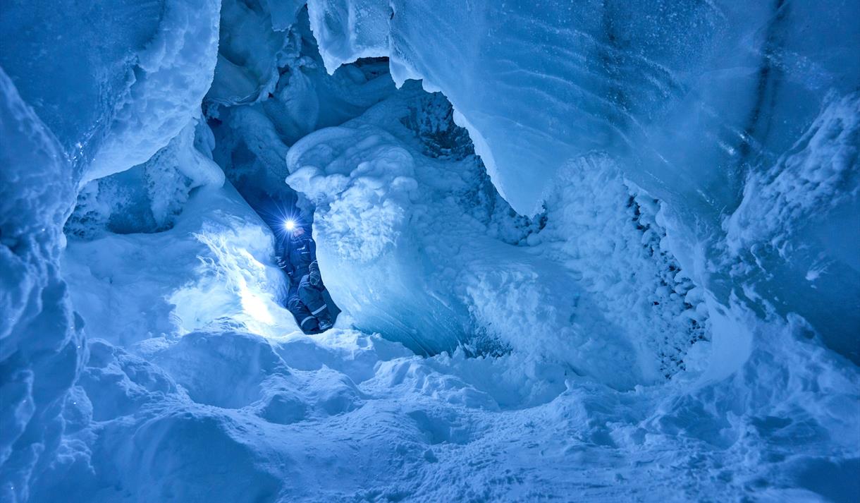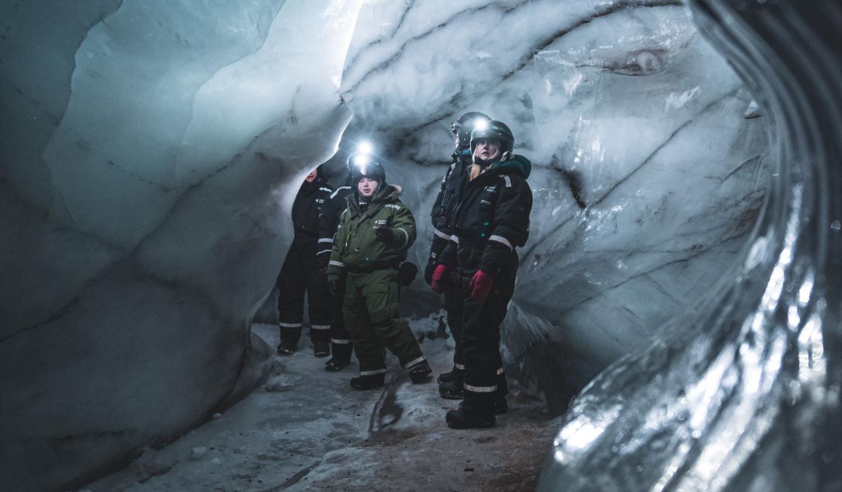 Vi kjører østover fra Longyearbyen, gjennom Adventdalen og Helvetiadalen, før vi kommer til Tellbreen. Her setter vi fra oss snøscooterne og går ned i isen. Smeltevannskanaler sommerstid skaper fantastiske formasjoner og ganger som vi tar oss gjennom, det er som å komme til en helt annen verden. Vi spiser lunsj enten nede i isgrotta eller oppe på breen, avhengig av været, før vi returnerer til Longyearbyen.
