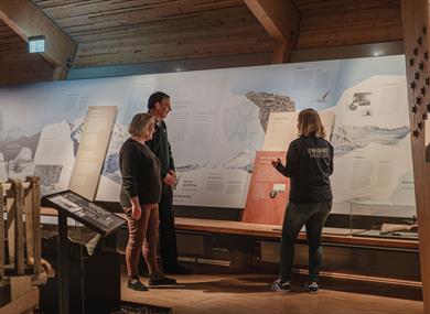Bli med gjennom Svalbards historie, fra oppdagelsen i 1596 og frem til i dag. La deg imponere av den ekstreme naturen, se forhistoriske øgler svømme forbi og gå inn i en ekte fangsthytte.